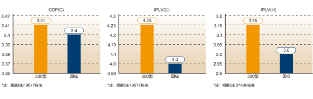 隨著環(huán)境溫度的降低,充足的換熱面積,可有效提升制熱量和能效比,充分保障高水溫和高舒適度 -12℃環(huán)境,41℃出水溫度時(shí),制熱量達(dá)7℃環(huán)境制熱量的61%以上 -20℃環(huán)境,45℃出水溫度時(shí),COP最高可達(dá)2.15 300型按照GB19577《冷水機(jī)組能效限定值及能效等級(jí)》標(biāo)準(zhǔn),環(huán)境溫度35℃,7℃出水溫度 時(shí),制冷COP值達(dá)到3.41,IPLV(C)達(dá)到4.23 ,均超過國家1級(jí)能效 300型按照GB37480《低環(huán)境溫度空氣源熱泵(冷水)機(jī)組能效限定值及能效等級(jí)》標(biāo)準(zhǔn),環(huán)境 溫度-12℃(風(fēng)機(jī)盤管型),制熱IPLV(H),即供暖綜合性能系數(shù),高達(dá)3.15 , 遠(yuǎn)超國家1級(jí)能效