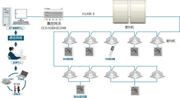 日立空調中央管理系統可實現將全部空調室內機機組與電腦連接起來,通過電腦實現系統全部自控,功能強大,操作簡單明了;還可通過通信網絡,實現遠程監控。