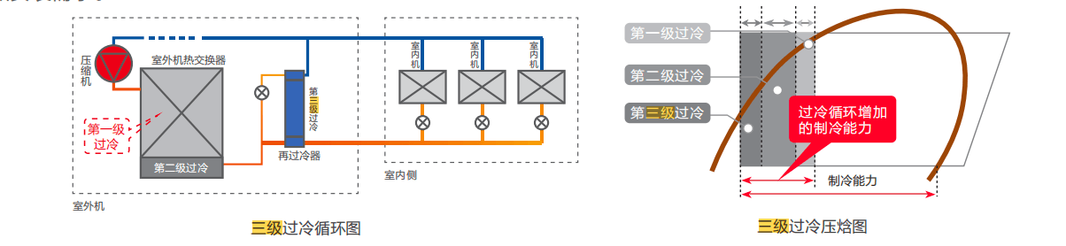 第二級過冷:獨有的超高流速液態冷媒過冷段 第一級過冷后的液態冷媒匯合后,單獨設計一個換熱器再次對液態冷媒進行過冷,由于匯合后的冷媒流量大,流速十分高,換熱效率也急劇增大,從而使得過冷度增加。