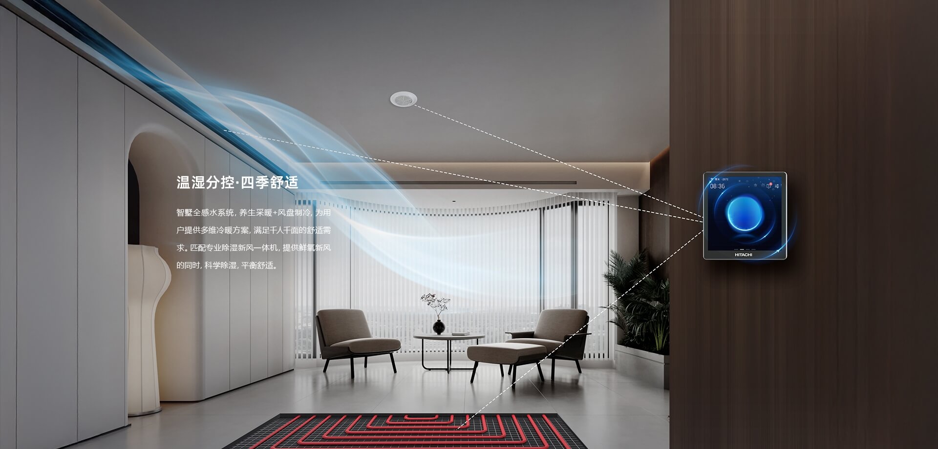 日立智慧屏進一步升級,可實現空調、地暖、新風、除濕、加濕系統一體化控制,也可獨立操控,高效便捷。系統間的聯動控制可實現自動化空氣管理,AI級智能調節,復雜系統簡單設定,一鍵運行,使用無憂。