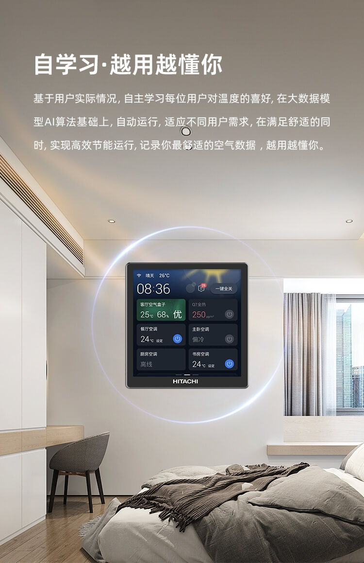 日立智慧屏進一步升級,可實現空調、地暖、新風、除濕、加濕系統一體化控制,也可獨立操控,高效便捷。系統間的聯動控制可實現自動化空氣管理,AI級智能調節,復雜系統簡單設定,一鍵運行,使用無憂。