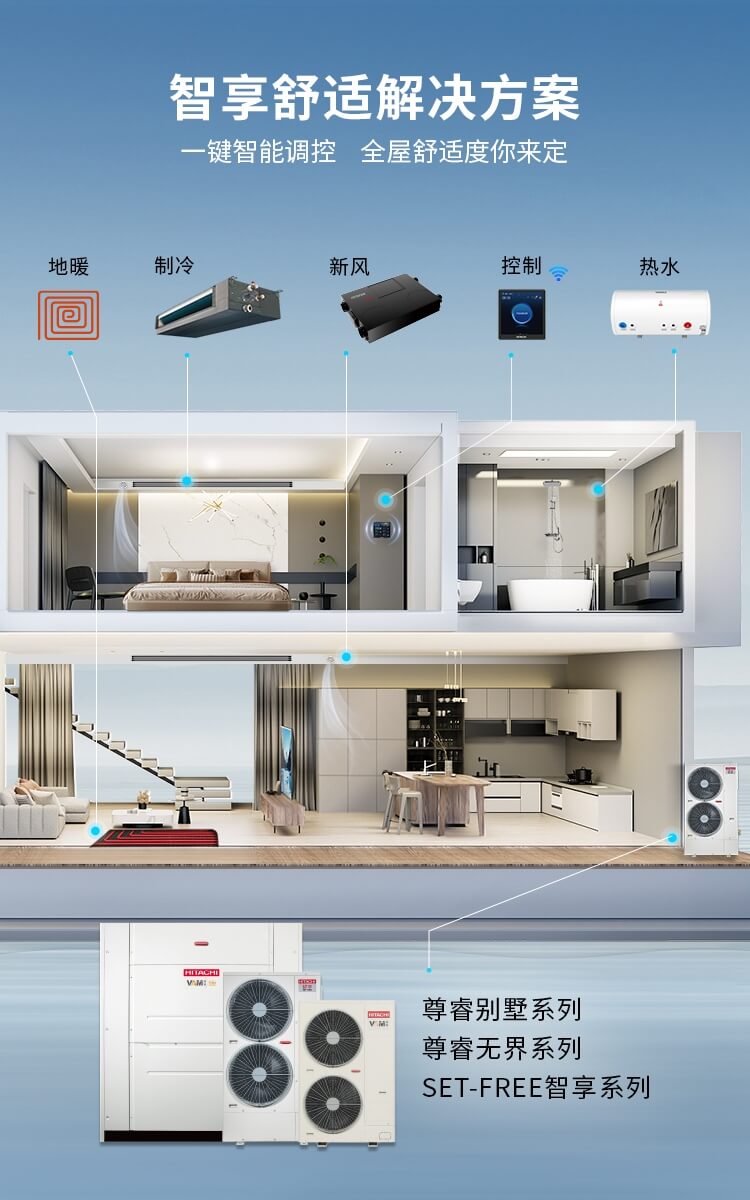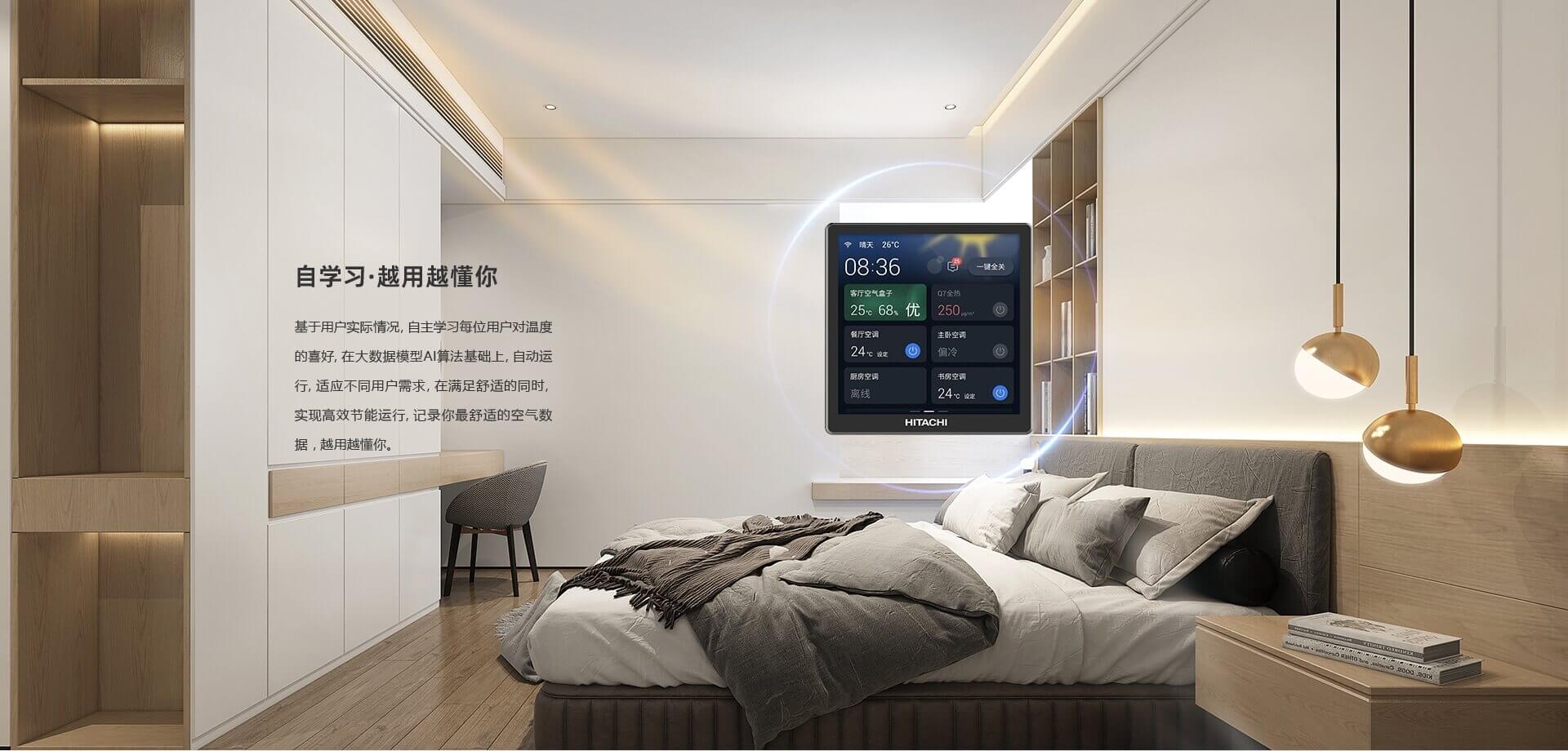 日立智慧屏進一步升級,可實現空調、地暖、新風、除濕、加濕系統一體化控制,也可獨立操控,高效便捷。系統間的聯動控制可實現自動化空氣管理,AI級智能調節,復雜系統簡單設定,一鍵運行,使用無憂。