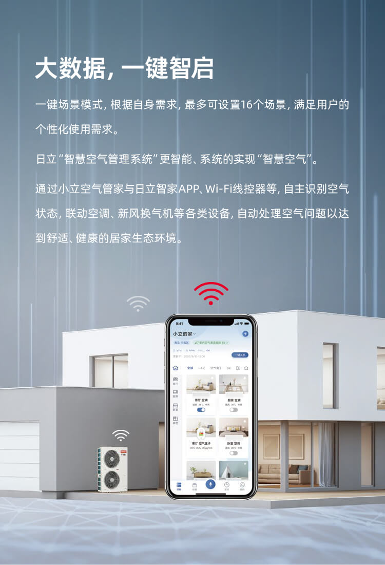 基于日立大數(shù)據(jù)模型AI技術,一鍵即可自動調(diào)節(jié)房間的溫度、濕度、新風,讓機組處于最佳運行狀態(tài),節(jié)能提升8%以上。