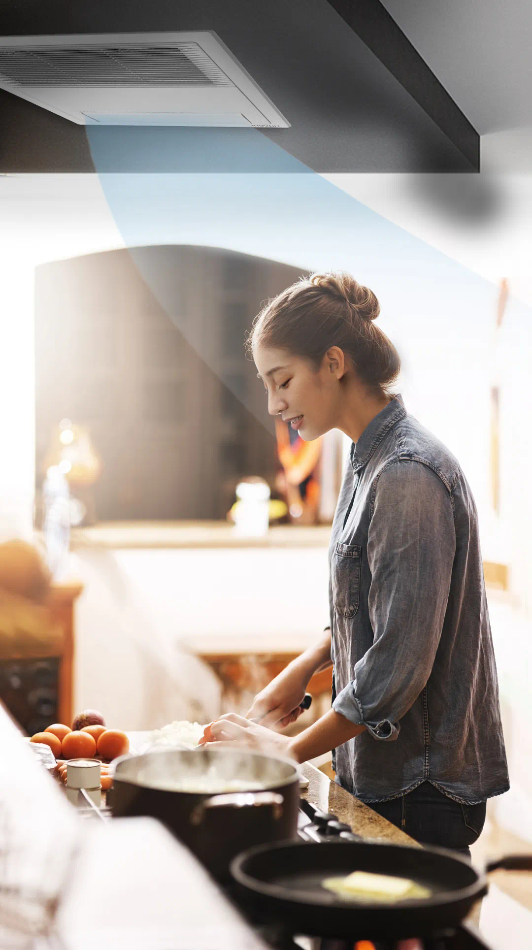 烹飪時會產(chǎn)生大量熱蒸汽、熱輻射,廚房溫度高,日立廚房空調(diào)強勁送風(fēng),舒適氣流自上而下均勻覆蓋,不會對煤灶的明火暗火產(chǎn)生影響。還可選配低溫除濕模塊,10℃低溫除濕,時時保證廚房的干爽環(huán)境,保護食材及廚具不受潮濕影響。