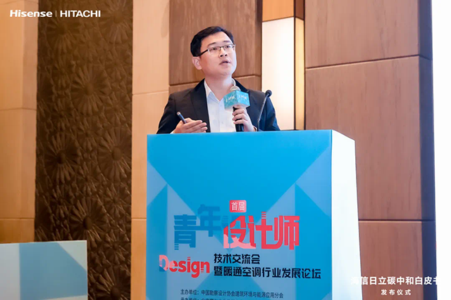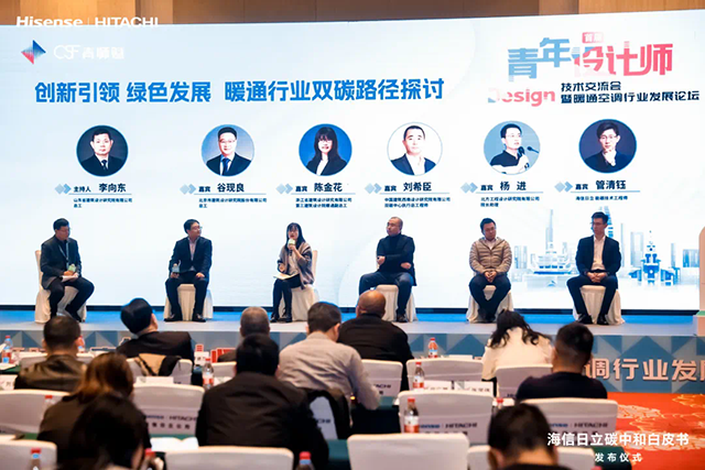 “創新引領、綠色發展,暖通行業雙碳路徑探討”論壇環節,山東省建筑設計研究院有限公司總工 李向東為主持人,北京市建筑設計研究院股份有限公司總工 谷現良,浙江省建筑設計研究有限公司第三建筑設計院暖通副總工 陳金花,中國建筑西南設計研究院有限公司雙碳中心執行總工程師 劉希臣,北方工程設計研究院有限公司院長助理 楊進,以及海信日立能碳技術工程師 管清鈺作為論壇嘉賓,聚焦行業節能降碳切入點、科技創新發力點、綠色供應鏈生態建設、綠色產品創新、企業管理制度等多元維度,結合《海信日立碳中和白皮書》帶來的啟示,充分碰撞思想火花,共探綠色發展更多智慧與實現路徑。