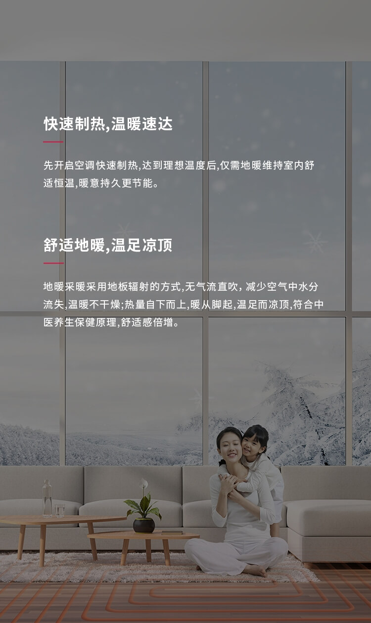 先開啟空調快速制熱,達到理想溫度后,僅需地暖維持室內舒適恒溫,暖意持久更節能。